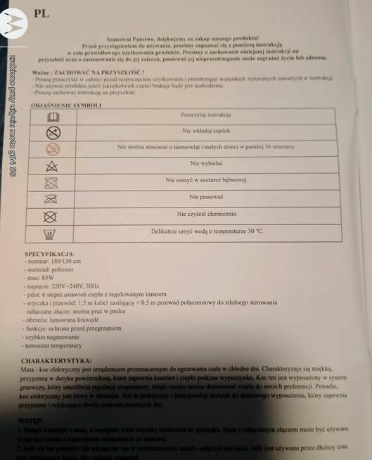 Sprzedam nieużywany koc elektryczny 160 x 130 cm, bardzo miły w dotyku, 230V. NA ZIMOWE WIECZORY